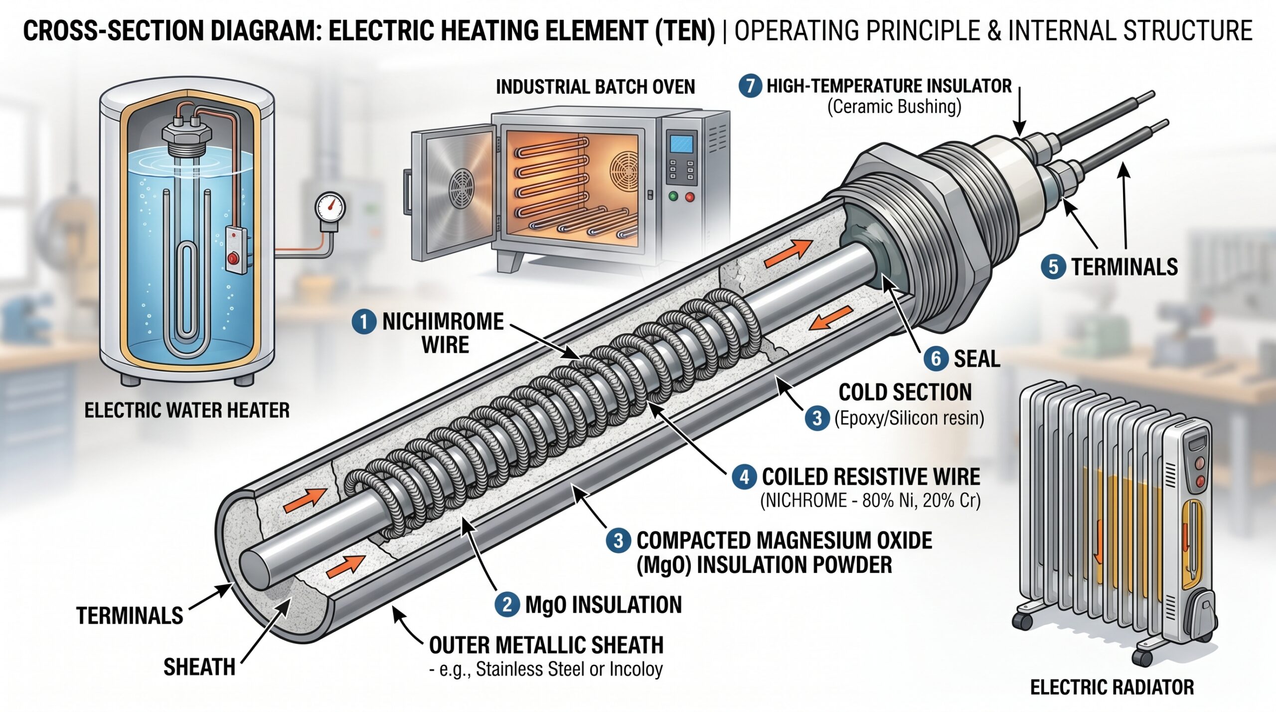 При подаче напряжения ток бежит по спирали. Из-за высокого сопротивления металла она мгновенно раскаляется. Это тепло проходит через плотный слой диэлектрика к металлической оболочке, а от нее — к воде, маслу или воздуху. Жесткая фиксация спирали внутри наполнителя гарантирует равномерный нагрев и защиту от перегорания.