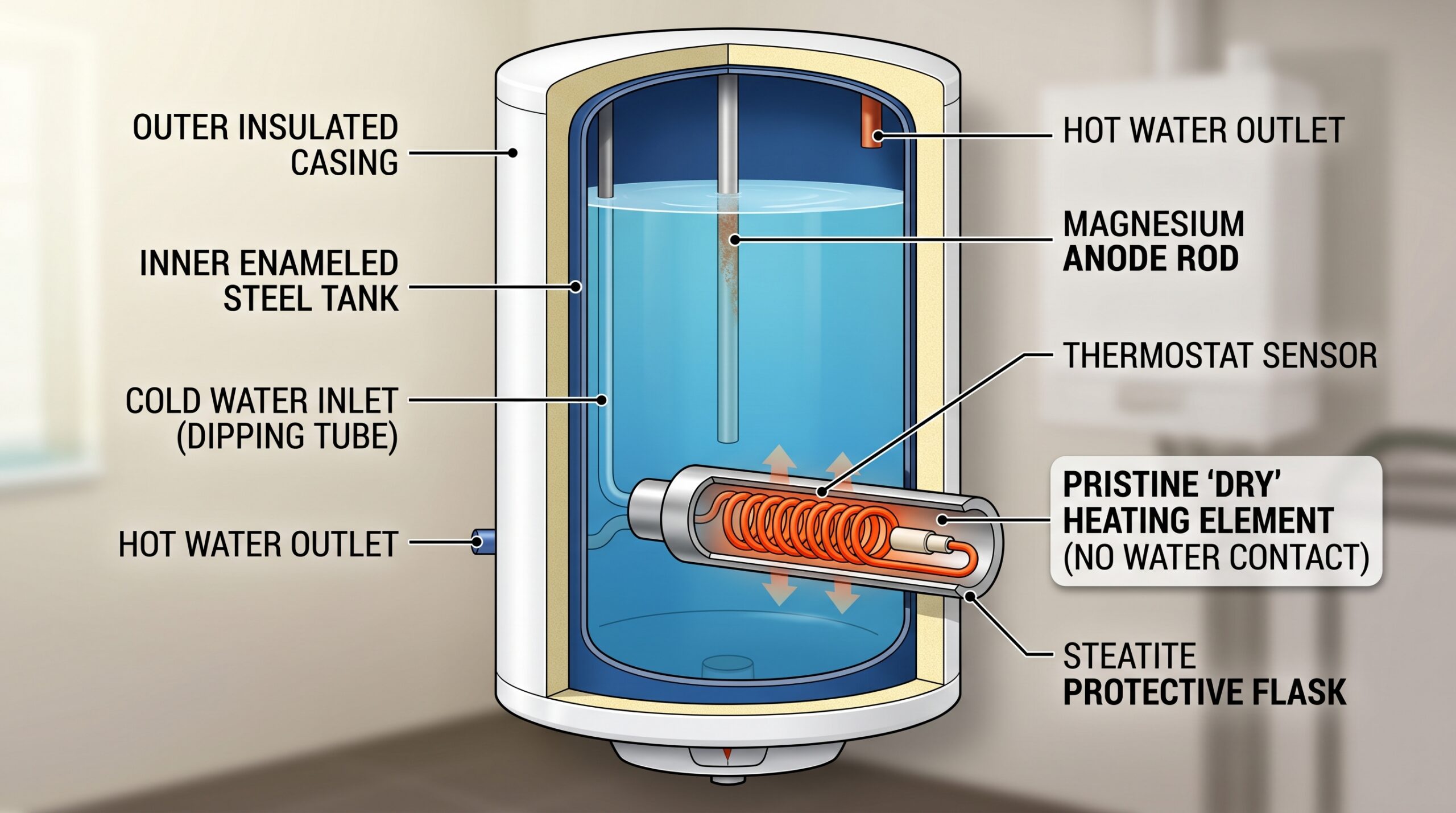 ТЭН — сердце бойлера. В обычных моделях он работает прямо в воде, поэтому быстро обрастает накипью и ржавеет. Сухой ТЭН — это нагреватель, спрятанный в герметичную колбу (стальную или стеклокерамическую). Вода греет колбу, а не сам элемент. Такая изоляция кратно увеличивает срок службы детали. Для более глубокого понимания этой технологии и ее преимуществ, прочтите наш полный гид по выбору и преимуществам сухих ТЭНов.