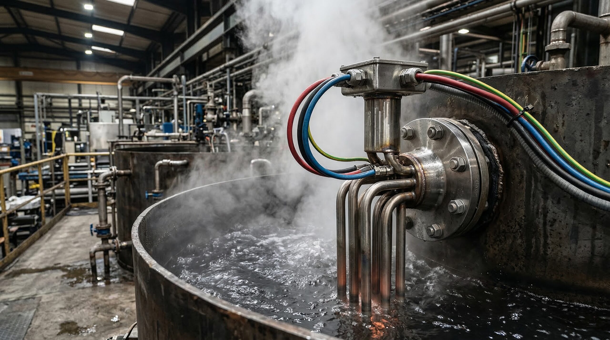 - Пищевая промышленность: Нагреватели из нержавеющей стали (AISI 304/316) применяются для нагрева воды, молока, сиропов и других пищевых жидкостей, где важны гигиеничность и коррозионная стойкость.